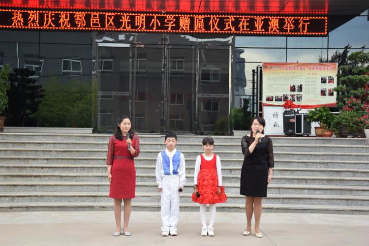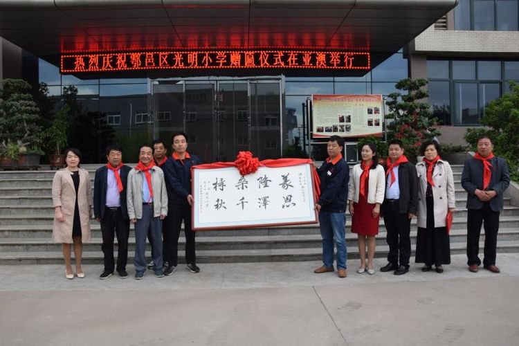 2018年4月28日上午10時,西安市鄠邑區光明小學為亞澳農機總部贈匾儀式順利舉行,鄠邑區政府辦副主任、機關事務管理局局長滑益平,區經貿局副局長趙曉利,區中小企業服務中心趙建威,區光明小學校長馬文博、副校長張忠偉、王冰榮及老師、同學們,以及亞澳農機董事長史可器、總經理史森強、副總經理史炳直等亞澳全體管理干部及黨員、工會委員、職工代表等參加活動。局副局長趙曉