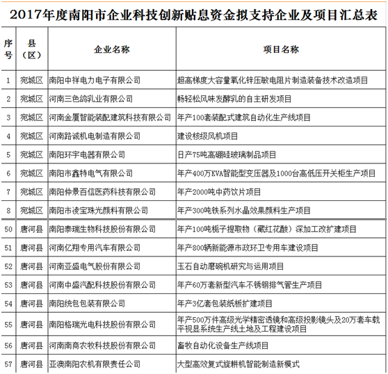 根據(jù)市工信委、市科技局、市財政局《關(guān)于申報2017年度南陽市企業(yè)科技創(chuàng)新貼息資金的通知》(宛工信聯(lián)〔2018〕114號)的相關(guān)要求,依照《2017年度南陽市財政支持企業(yè)科技創(chuàng)新貼息項(xiàng)目資金評審辦法》,2018年10月10日—12日,市工信委、市科技局、市財政局共同組織專家對企業(yè)申報材料進(jìn)行了評審,根據(jù)專家評審意見,經(jīng)研究,現(xiàn)將擬支持的71家企業(yè)共計71個項(xiàng)目予以公示。歡迎社會各界參與監(jiān)督,如有異議,請以電話或書面形式向市工信委、市科技局、市財政局反映。